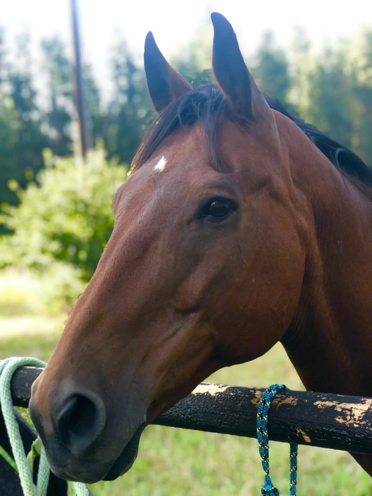 Hudson is a bay colored thoroughbred/quarter horse, who loves to be in the back of the line so he can keep tabs on everyone. He is peppy and opinionated and loves to boss the other horses around. We call him Hollywood Hudson as he is a little full of himself and likes to be admired, (he will push the other horses away so he can hog all the attention and treats). He is currently enjoying his well earned retirement, enjoying lounging around in the pasture, playing in the sprinkler and eating whenever he wants. Hudson’s big plans for the summer include an apple eating contest he is confident he will win (jk). =)