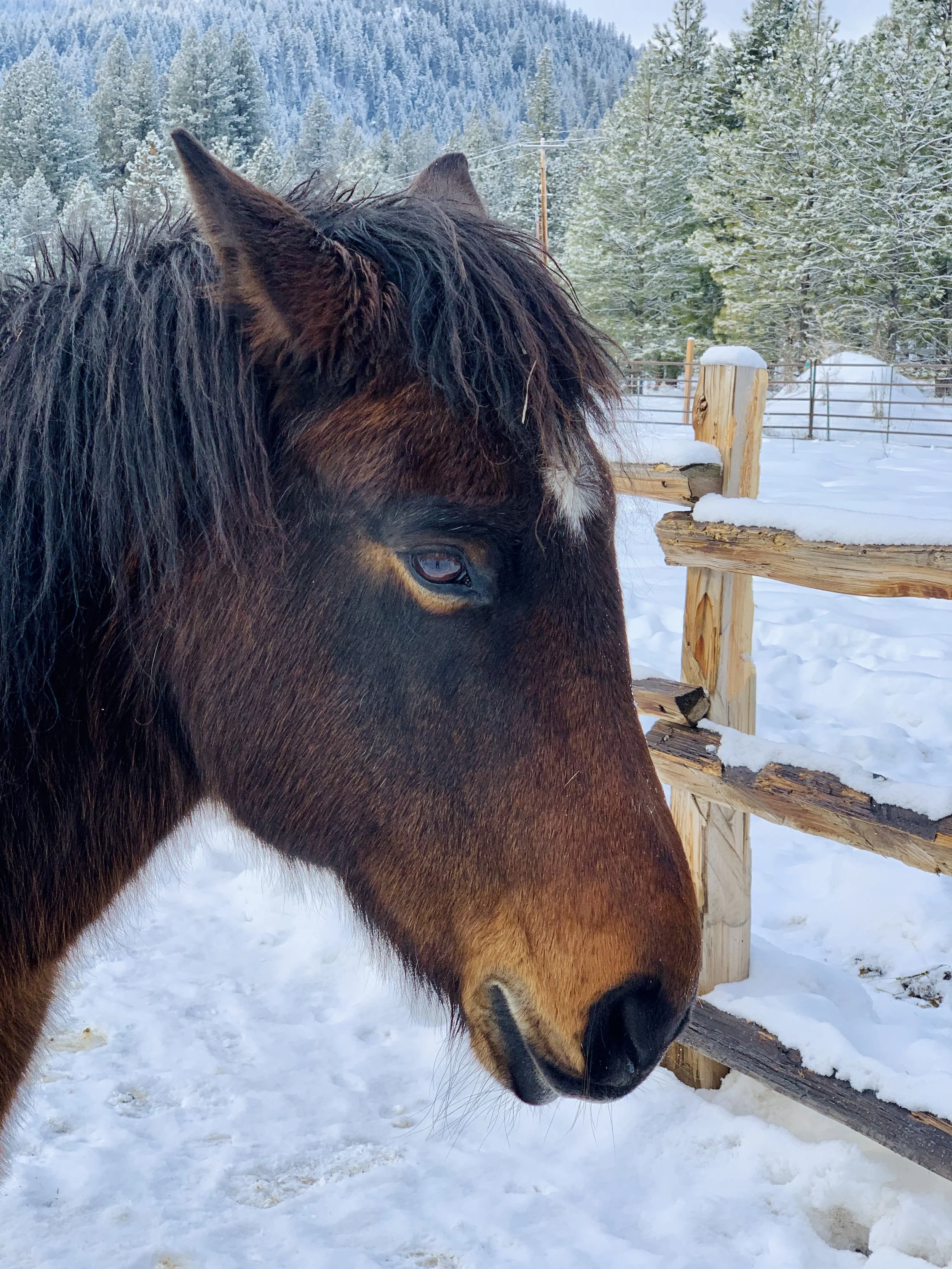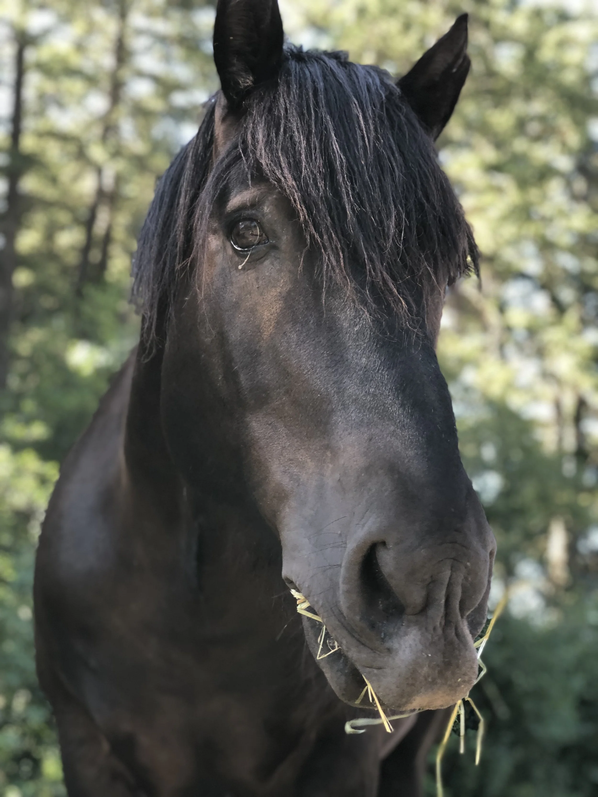 Bo Jangles is a big 2,000lb jet black Percheron draft horse. He is a gentle giant, very calm and steady on the trail. Not a lot ruffles his feathers. He is quite the social butterfly with other horses. He voices his concerns whenever we take a horse from the field and he isn’t invited. He loves all people, but tends to be on the dramatic side in his interactions with the other horses at the hitching post, and it isn’t uncommon to hear his high pitched “pony squeal”. Bo Jangles journeyed from the midwest, where he had been a plow horse with the Amish. In the winter he and his partner pull sleighs at Mountain Springs Lodge.
