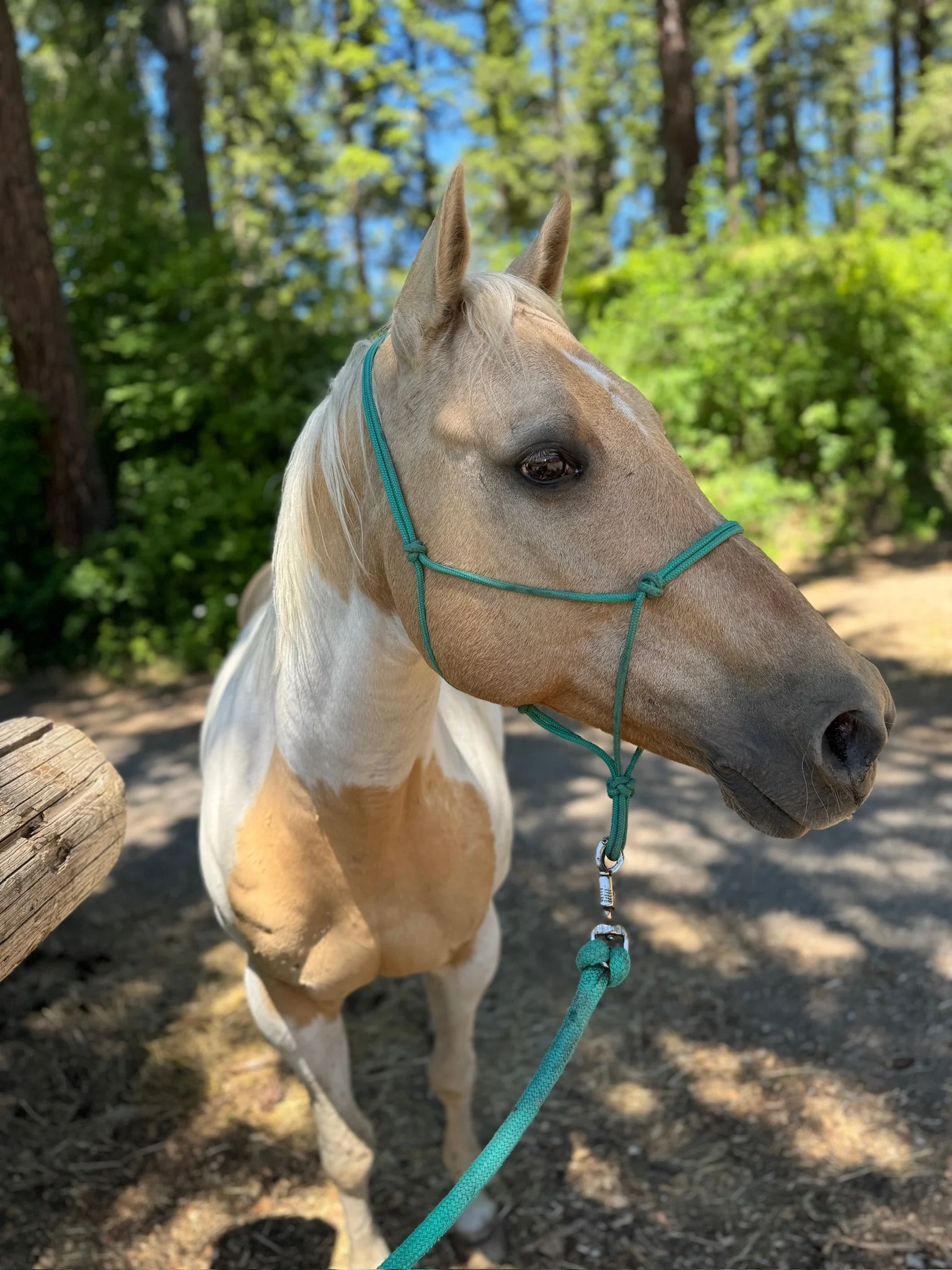 Caspian is a stunning “silver bay”mustang, born wild in Arizona. From the “Cerbat herd” his herd’s lineage can be traced back to the Colonial Spanish horses. He is very alpha and quite the ladies man. He usually has his harem of mares surrounding him and isn’t afraid to assert his dominance if any of the geldings “forget their place”. Caspian absolutely loves playing in the water, whether it’s a water trough or a puddle… He is playing in it. His dominance is not reserved only toward horses, and requires an experienced, firm hand out on the trails. He is an independent thinker, not overly fond of affection, has a very level head and abundant willingness to climb any mountain you put in front of him.