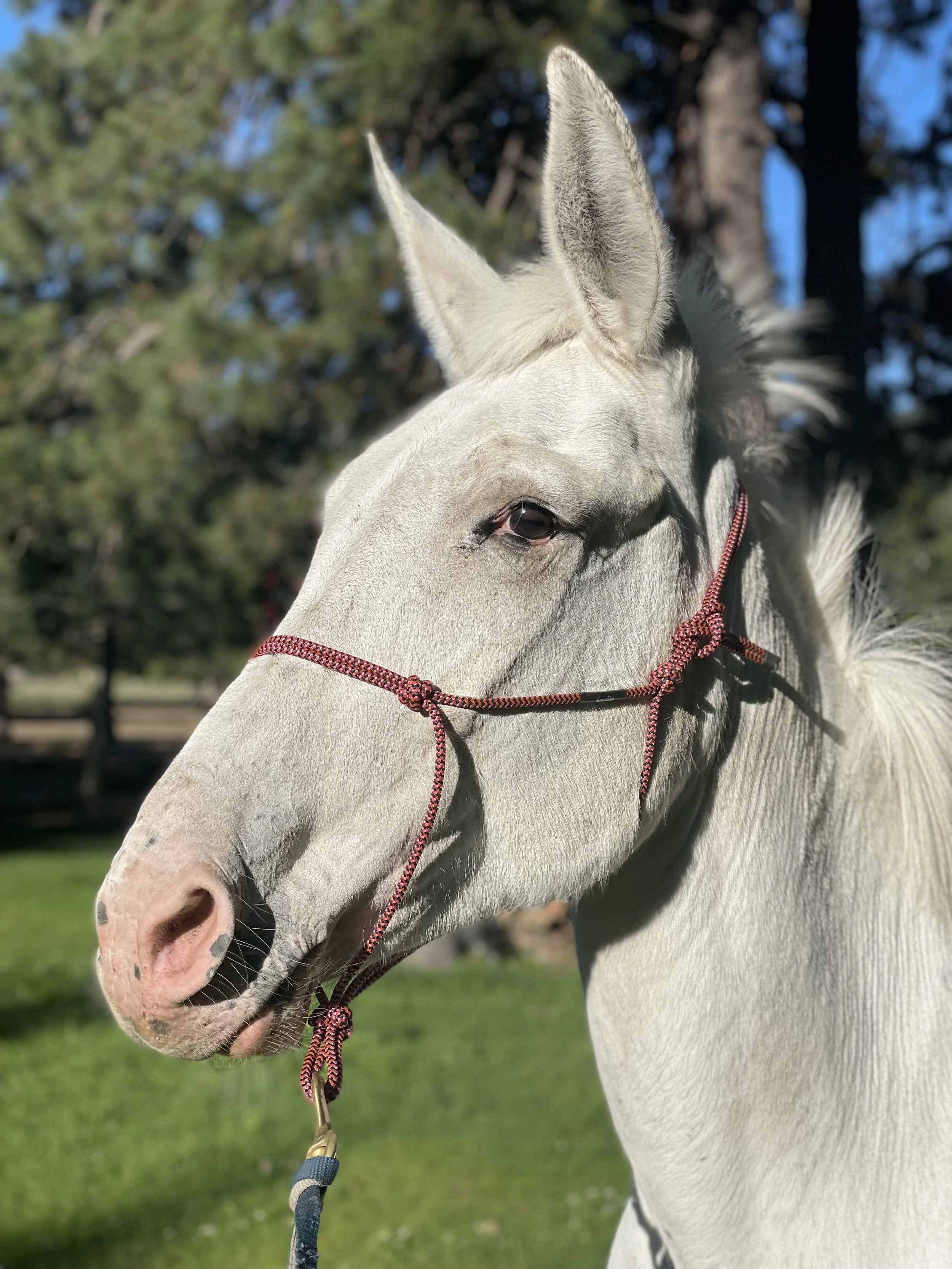 Taloolah is a white, standard bred mule (half donkey, half horse). She is a shy girl and is learning to trust. We aren’t sure what her earlier life looked like. If you love underdogs, you’ll love her. She has a big heart and tries really hard to please her rider, but sometimes gets a bit nervous about new things. She faces her fears like the brave girl she is, but does best when she’s partnered with a patient, confident person who can offer her support if her courage slips a little.