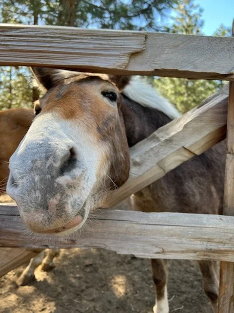 We love Charlie’s big ears, and larger than life personality. He has a lot in common with Curious George, curious, playful and is constantly getting into things…everything goes in the mouth….brushes, jackets, water bottles, buckets and lead ropes. He likes to untie himself (or a buddy) and dump water buckets. While patience may not be his virtue (yet) we are holding out hope he will someday master the art of standing patiently as he waits until everyone is ready. He has a working dog mentality, and loves “adventuring” (ie trail riding). He behaves like a perfect gentlemen….once his feet are moving. He adores attention and is often very demanding to get his scratches. While he may have the attention span of a goldfish, he’s so likable you can’t stay mad at him.