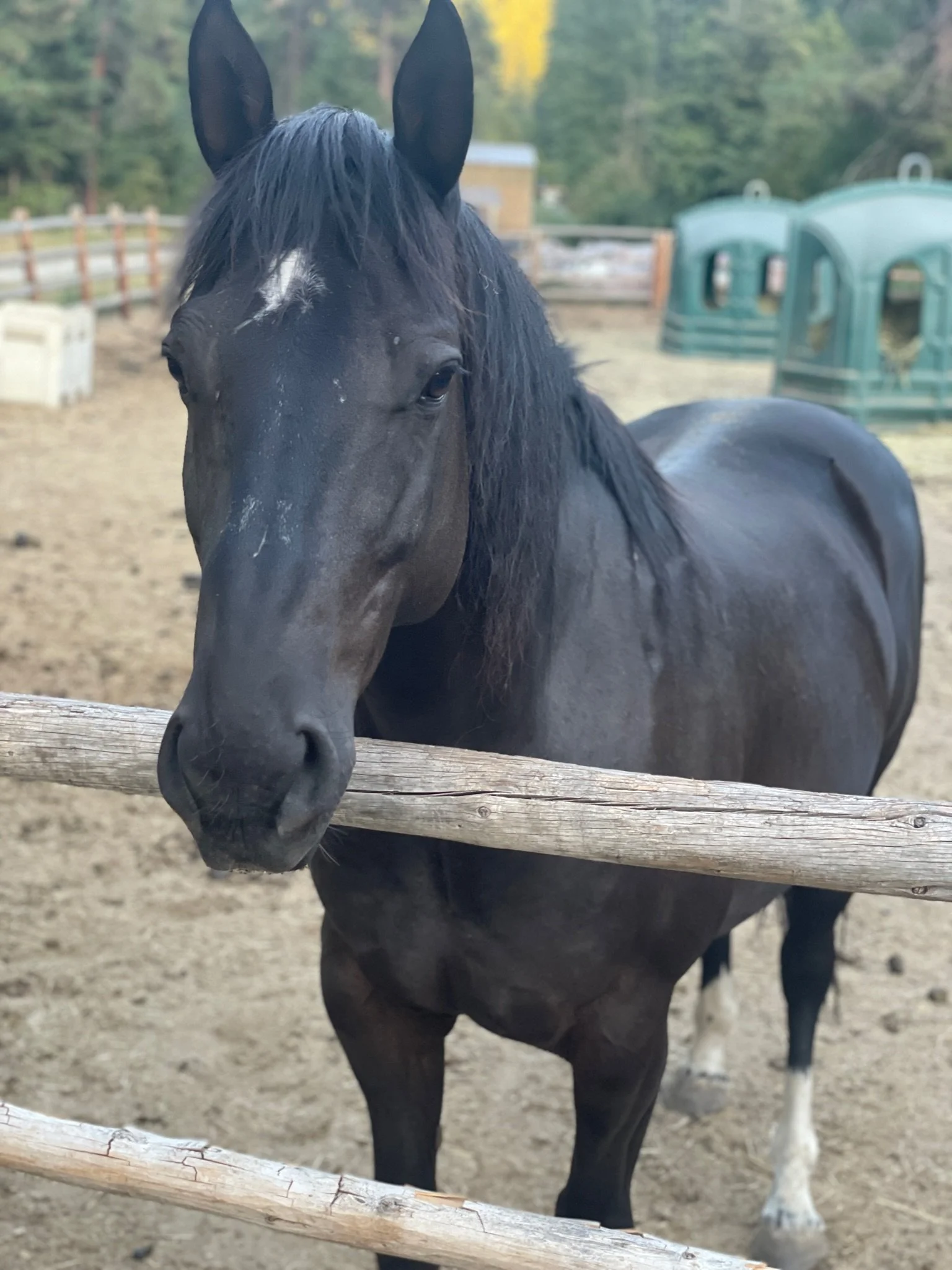 Standing at 15.2 hands, Nighthawk is 1,100 pounds of sleek, black muscle. We had him DNA tested and the results came back: Percheron, Morgan and Quarter horse. He lived his early years out on a range in Idaho, with the hopes that he could be a rodeo bucking horse. Thankfully for us, he didn’t like to buck and was passed over. He came to us with very little training and unsure about humans. He quickly took over as herd leader and we are slowly building his foundation and trust. While still very new to trail riding, he is willing to learn and making great strides. While it may be a while before he is ready for guests, you may see him bravely leading the way as he is ridden by one of our guides.
